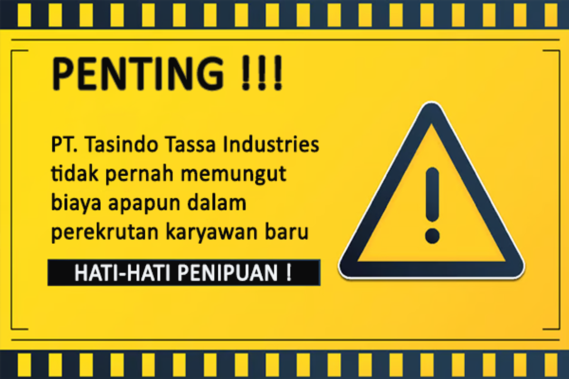 Harap diperhatikan: Rekrutmen PT Tasindo Tassa Industries hanya dilakukan secara resmi di area perusahaan. Kami tidak melakukan proses perekrutan di luar lingkungan PT Tasindo.